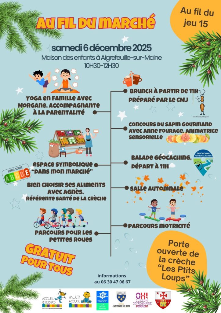 Une matinée “Bien manger, bien bouger” pour toute la famille AU FIL DU MARCHE La maison des enfants avec les mairies d’Aigrefeuille-sur-Maine et de Remouillé ainsi que l’association des Cabanes de Filomaine, organisent le samedi 6 décembre 2025 une matinée entièrement dédiée au plaisir de partager, d’apprendre et de bouger en famille. De 10h30 à […]