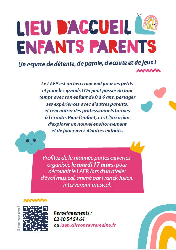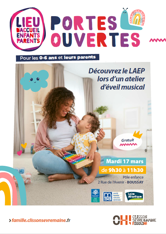 Une matinée portes ouvertes du Lieu d’Accueil Enfants Parents (LAEP) est organisée le mardi 17 mars, de 9h30 à 11h30, au Pôle enfance de Boussay.