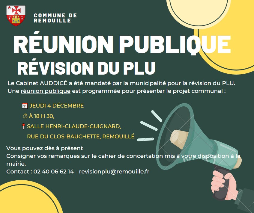 Vous pouvez dès à présent consigner vos remarques sur le cahier de concertation mis à votre disposition à l’accueil de la mairie. Il est possible également de nous adresser un courrier ou via la messagerie dédiée : 𝓇ℯ𝓋𝒾𝓈𝒾ℴ𝓃𝓅𝓁𝓊@𝓇ℯ𝓂ℴ𝓊𝒾𝓁𝓁ℯ.𝒻𝓇